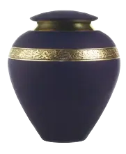 a dark blue urn with gold accents. It has a classic urn shape with a fitted lid and features a textured gold band around the middle. Gold also highlights the rim and the base of the lid.
